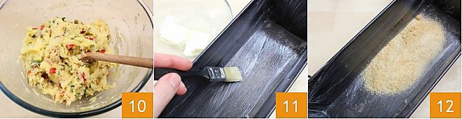 puis mélangez le tout très bien 10. Beurrez un moule à cake de 27x10 cm 11 et tapissez-le de chapelure 12 ;