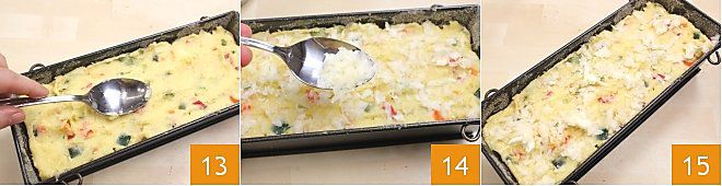 versez le mélange à base de pommes de terre dans le moule, égalisez-le avec une cuillère 13 et saupoudrez-le avec le fromage râpé réservé 14. Faites cuire dans un four statique pendant 50 minutes à 180° 15. Une fois prêt, démoulez la terrine mille-saveurs et servez-la encore chaude.