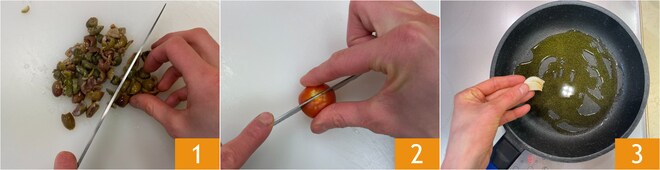 Pour préparer le thon à la poêle, commencez par hacher grossièrement les olives taggiasches et les câpres dessalés 1. Lavez et coupez en deux les tomates cerises 2. Dans une poêle, chauffez un filet d'huile avec une gousse d'ail en chemise 3.