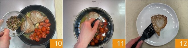 Complétez avec le hachis d'olives et de câpres 10, puis couvrez avec le couvercle et laissez cuire pendant 10 minutes à feu moyen 11. Une fois prêt, servez immédiatement les filets de thon 12.