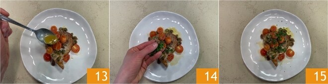 Complétez avec la petite sauce aux tomates cerises 13 et une pincée de persil frais haché 14. Votre thon à la poêle est prêt à être dégusté 15 !