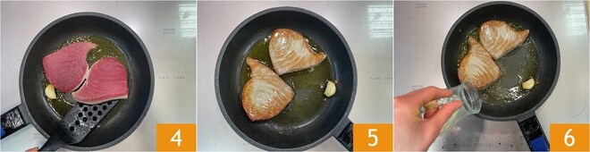 Déposez ici les filets de thon 4 et faites-les dorer 3 minutes de chaque côté 5. Déglacez avec le vin blanc 6 et laissez l'alcool s'évaporer.