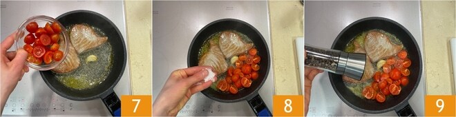 Ajoutez les tomates cerises 7, salez 8 et poivrez 9.