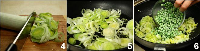 Émincez finement le poireau 4 et faites-le revenir dans une large poêle antiadhésive avec l'huile 5; laissez-le cuire doucement pendant environ 10-15 minutes, puis ajoutez les petits pois 6 et laissez-les cuire jusqu'à ce qu'ils soient bien tendres, environ 15 minutes ; si nécessaire, ajoutez en cours de cuisson soit du bouillon de légumes chaud soit de l'eau chaude.