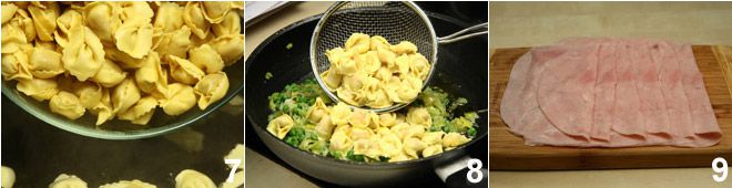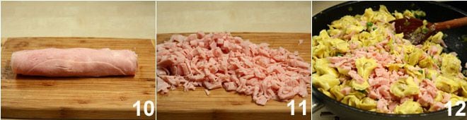 Égouttez-les très bien en faisant attention de ne pas les casser et ajoutez-les dans la poêle avec les petits pois et le poireau 8. Disposez sur une planche à découper le jambon cuit 9