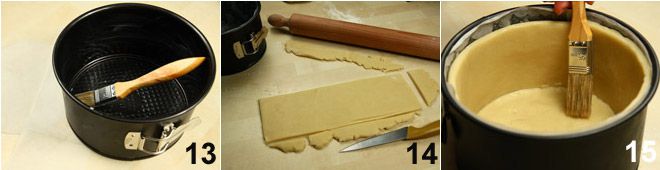 Beurrez un moule rond à charnière de 18cm x10cm 13; étalez la pâte brisée en une feuille épaisse d'environ 5mm et découpez une bande rectangulaire haute d'environ 10 cm 14 qui servira de côté au moule, un disque de 18cm qui servira de base inférieure et un autre disque toujours de 19 cm qui servira de base supérieure du timballo de tortellini.