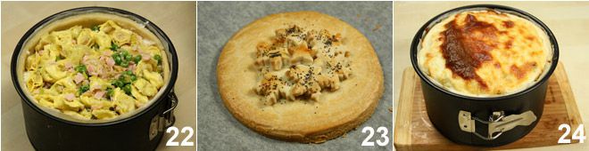 Retirez du four le disque-couvercle 23 et le timballo de tortellini 24, laissez refroidir puis ouvrez le moule à charnière en faisant très attention de ne pas casser votre timballo de tortellini. Disposez sur un plat de service et décorez avec le disque-couvercle. Maintenant, votre timballo de tortellini est prêt à rendre votre table de fêtes unique!
