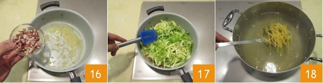 Lorsqu'elle est fondue, ajoutez également la pancetta 16 et faites cuire 1 minute à feu doux. Ensuite, ajoutez le chou et faites-le cuire pendant 5-6 minutes, en ajustant le sel et le poivre. Mélangez les ingrédients pour favoriser une cuisson uniforme 17. À ce stade, portez à ébullition de l'eau salée dans une grande casserole à bords hauts et faites cuire les pâtes 18.