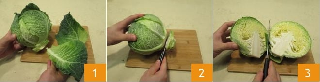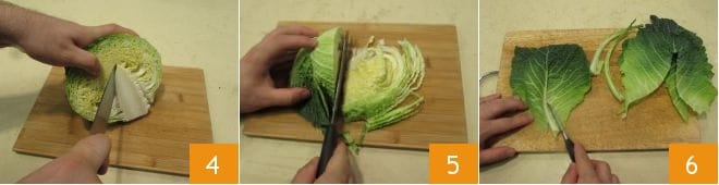 Pour préparer la timbale de chou avec fondue de taleggio, commencez par laver et sécher les légumes. Effeuillez le chou 1 et gardez les feuilles extérieures les plus dures de côté (environ 100 g). Coupez la base dure du trognon 2 et divisez-le en deux 3.