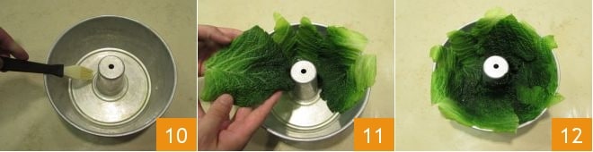 Prenez un moule à couronne de 18 cm de base, 23 cm d'ouverture, 9 cm de hauteur et huilez-le : veillez à badigeonner l'huile sur toute la surface 10. Prenez les feuilles de chou et puis tapissez le moule avec les feuilles de chou légèrement superposées 11 jusqu'à le recouvrir complètement 12 : mettez le moule de côté.