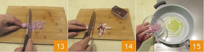 Passez maintenant à l'assaisonnement des pâtes: hachez finement l'échalote 13 et découpez la pancetta en dés 14. Prenez maintenant une poêle antiadhésive et versez-y l'huile, chauffez et faites fondre l'échalote à feu doux 15, en remuant de temps en temps pour éviter qu'elle ne colle au fond.