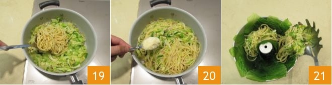 Lorsqu'elles sont al dente, égouttez-les directement dans la poêle avec l'assaisonnement 19, saupoudrez de Grana Padano râpé 20 et mélangez bien tous les ingrédients en cuisant pendant encore 2 minutes. Ensuite, transférez dans le moule 21.