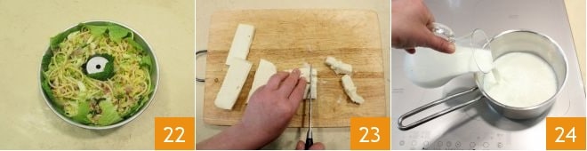 Nivelez les pâtes dans le moule et enfournez dans un four ventilé préchauffé à 200°C pendant 10 minutes (si vous utilisez un four statique, à 220°C pendant 20 minutes) 22. Pendant que la timbale est au four, préparez la fondue de taleggio en coupant le fromage en dés 23. Chauffez le lait dans une petite casserole 24 sans le porter à ébullition.