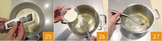 Aromatisez-le avec la noix de muscade 25 et faites fondre le beurre à feu doux dans une autre petite casserole. Versez maintenant la farine en pluie 26 tout en mélangeant les ingrédients avec un fouet à main : vous devez obtenir un roux assez épais et doré 27.