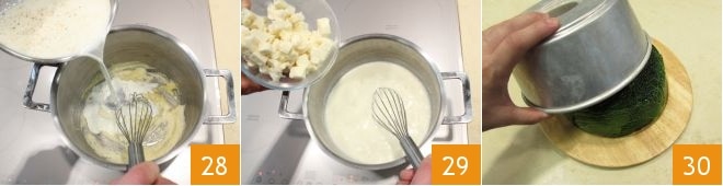 À ce stade, ajoutez le lait maintenant chaud 28 et faites épaissir à feu doux. Pendant que vous ajoutez le fromage 29, continuez à mélanger avec le fouet pour obtenir une crème homogène. Enfin, salez et poivrez. À ce stade, la timbale sera prête : sortez-la du four et laissez-la tiédir, puis démoulez-la en la retournant délicatement sur un plat de service 30.