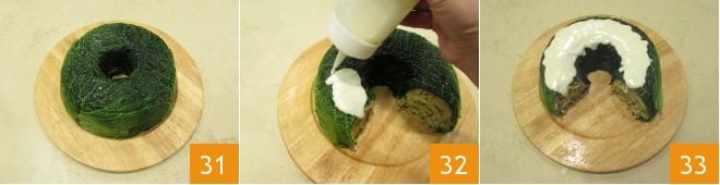 Une fois démoulée la timbale 31, transférez la fondue de taleggio dans un flacon de cuisine et versez-la sur votre préparation 32. La timbale de chou avec fondue de taleggio est prête à être dégustée 33!