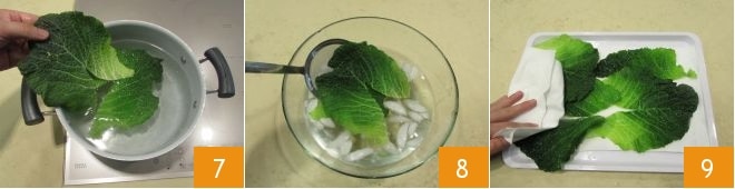 Dans une casserole à bords hauts, portez à ébullition une grande quantité d'eau salée et faites blanchir les feuilles pendant quelques secondes 7. Transférez-les dans un récipient avec de l'eau et des glaçons 8: ainsi, les feuilles resteront d'une belle couleur brillante. Séchez-les ensuite avec un torchon de cuisine bien propre 9 et mettez de côté.