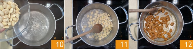 Ajoutez les amandes 10 et remuez continuellement 11. Les amandes vont commencer à cristalliser, puis le sucre va fondre à nouveau et prendre la couleur typique du caramel 12.