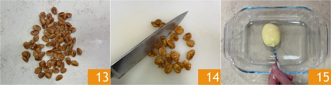 À ce stade, versez les amandes sur un plan de travail en marbre 13 ou sur une plaque de cuisson et laissez-les refroidir. Une fois refroidies, hachez-les au couteau 14. Tout est prêt pour monter le tiramisu. Dans un plat, créez une fine couche de crème 15.