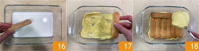 Imbibez les boudoirs de lait 16, ou si vous préférez de café, et créez une couche de boudoirs 17. Couvrez avec une autre couche de crème 18.