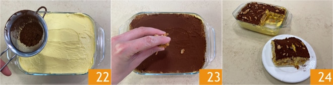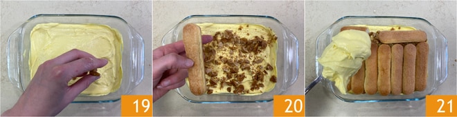 À ce stade, ajoutez la moitié des amandes caramélisées hachées 19, continuez avec une autre couche de boudoirs imbibés 20 et une autre couche de crème 21.