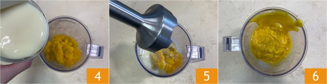 Prélevez la chair et mettez-la dans un pichet, ajoutez le lait concentré 4 puis mixez avec un mixeur plongeant 5 jusqu'à obtenir un mélange lisse et homogène 6. Couvrez de film plastique et laissez refroidir au réfrigérateur.