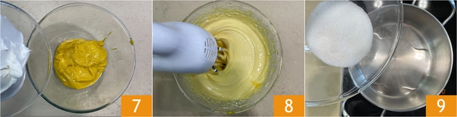 Une fois froid, transférez-le dans un bol, ajoutez le mascarpone 7 et fouettez avec un batteur électrique 8 pour obtenir un mélange mousseux. Laissez reposer au frais jusqu'au moment de l'utilisation. Passez maintenant aux amandes caramélisées. Dans une casserole, versez l'eau et ajoutez le sucre 9. Faites fondre le sucre à feu moyen.