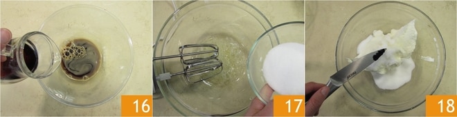 Pour le sirop : préparez 100 g de café moka et laissez-le refroidir, puis versez-le dans un bol et ajoutez la liqueur de café 16. Préparez la crème : versez les blancs d'œufs dans un bol et commencez à les monter avec les fouets propres ; quand ils seront bien mousseux, ajoutez 60 g de sucre et montez-les en neige 17. Dans un bol, mélangez le mascarpone, 60 g de sucre et les graines de 2 gousses de vanille 18.