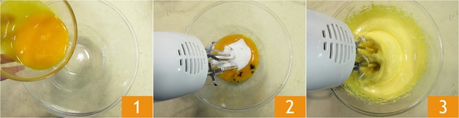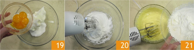 Ajoutez également les jaunes 19 et travaillez le tout avec les fouets électriques pour obtenir un mélange uniforme et bien monté. Maintenant, fouettez à moitié la crème fraîche liquide dans un bol séparé 20 et ajoutez-la à la crème de jaunes 21. Mélangez avec les fouets pour l'incorporer.