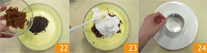 À ce stade, ajoutez le chocolat noir à 70% finement haché et le caramel salé en petits morceaux très fins (facultatif) 22. Enfin, incorporez les blancs en neige en mélangeant délicatement avec une spatule en silicone de bas en haut. Mettez la crème obtenue dans une poche à douille. Vous pouvez déjà préparer le moule de 10 cm de diamètre, si possible tapissé de rhodoïd 24.