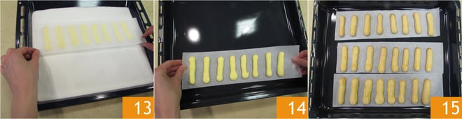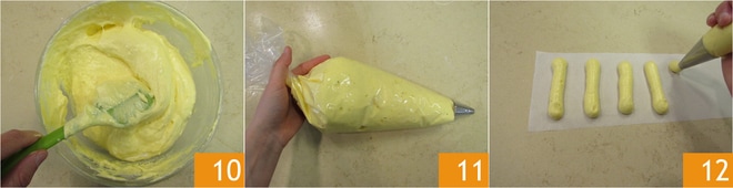 Ajoutez les poudres au mélange d'œufs et mélangez très délicatement toujours avec une spatule en silicone, de bas en haut 11. Mettez la pâte obtenue dans une poche à douille avec une douille lisse de 10 mm 12. Procédez à former les biscuits à la cuillère sur des bandes de papier sulfurisé d'environ 10 cm de large : vous devez former des bâtonnets d'environ 8 cm de longueur 12.