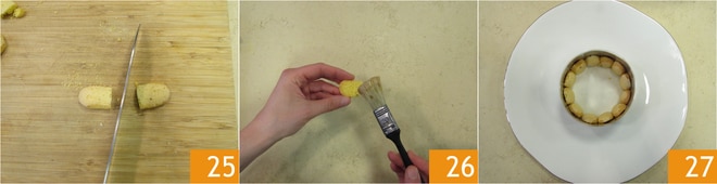 Divisez 6 biscuits à la cuillère en deux 25, taillez-les légèrement dans le sens de la longueur pour les égaliser et badigeonnez la partie taillée avec le sirop de café 26. Placez les biscuits à la cuillère dans le moule de manière à tapisser tout le périmètre avec la partie arrondie vers le haut et celle taillée vers l'extérieur 27.