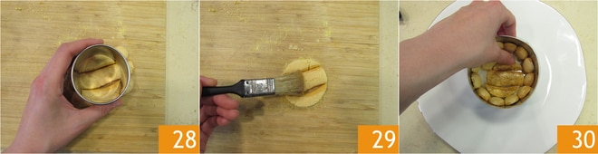 Placez côte à côte 3 biscuits à la cuillère et découpez-les avec un emporte-pièce de 8 cm 28, badigeonnez la surface avec le sirop de café 29 puis posez-les au fond de l'anneau 30. Ensuite, imbibez également l'intérieur des biscuits à la cuillère du périmètre.