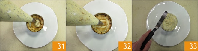 Recouvrez d'une couche abondante de crème au mascarpone 31, puis posez 3 autres biscuits à la cuillère découpés, badigeonnez-les avec le sirop et recouvrez avec plus de crème 32. Nivelez la dernière couche de crème avec une spatule 33. Laissez au réfrigérateur pendant 10 minutes.