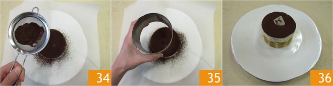 Saupoudrez la surface de cacao amer en poudre 34. Lorsque vous devrez servir, retirez délicatement le moule 35 et dégustez votre tiramisu au chocolat 36 !