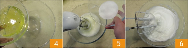 Passez au montage des blancs (ils ne doivent pas contenir de traces de jaune) avec des fouets électriques propres. Seulement quand vous aurez commencé à les monter et qu'ils seront déjà mousseux, ajoutez 90 g de sucre en poudre en gardant les fouets en marche 5 : vous devez obtenir une neige ferme 6.