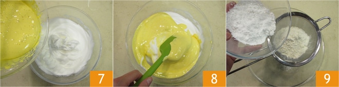 Vous pouvez verser les jaunes sur les blancs 7 et mélanger délicatement avec une spatule en silicone de bas en haut pour ne pas démonter le mélange 8. Tamisez la fécule et la farine 9.