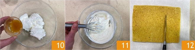 Entre-temps, préparez la crème au yaourt : dans un bol, versez le yaourt grec et le miel 10, puis mélangez bien avec un fouet 11. Prenez la pâte biscuit et coupez-la en rectangles de la même taille que le plat où vous allez composer votre tiramisù (le nôtre mesure 22x17 cm) 12.