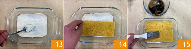 Répartissez un peu de crème au yaourt au fond 13, puis déposez la pâte biscuit 14 et imbibez avec le café froid 15.