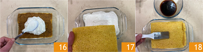 Étalez environ la moitié de la crème au yaourt grec 16 et continuez avec une autre couche de pâte biscuit 17 à imbiber avec le café 18.