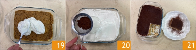Terminez avec la crème de yaourt grec restante 19, nivelez bien, puis saupoudrez de cacao amer tamisé 20. Laissez reposer votre tiramisù au yaourt grec au réfrigérateur pendant au moins 2 heures avant de le servir 21 !