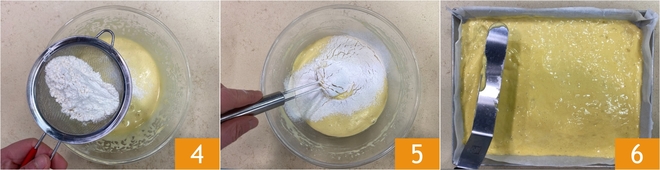 Tamisez la farine 4 et incorporez-la délicatement avec une spatule 5. Transférez le mélange dans une plaque de 35x28 cm recouverte de papier sulfurisé et nivelez soigneusement 6.
