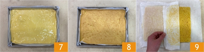 Faites cuire la pâte biscuit dans un four statique préchauffé à 180° pendant environ 15 minutes 7. Quand elle est cuite 8, retournez-la sur une feuille de papier sulfurisé et laissez refroidir complètement. Une fois refroidie, retirez délicatement le papier sulfurisé supérieur 9.
