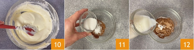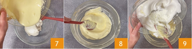 À ce stade, mélangez les jaunes d'œufs et le sucre montés avec le mascarpone placé dans un grand bol 7, remuez pour obtenir une crème douce 8 et faites de même avec les blancs montés en neige 9.