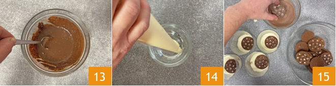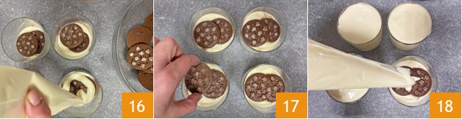 Continuez à mélanger pour éviter les grumeaux 13. Transférez la crème dans une poche à douille sans embout et versez-en un peu au fond de 4 verres 14. Trempez rapidement les biscuits, deux pour chaque verrine, et disposez-les sur la crème 15.