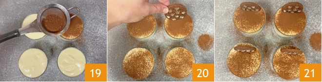 Enfin, saupoudrez de peu de cacao en poudre 19. Pour décorer, vous pouvez utiliser un biscuit non trempé, à placer en vertical pour chaque verrine 20 : vos verres de tiramisù avec biscuits Pan di Stelle® sont prêts. Ils peuvent être laissés à reposer au réfrigérateur pendant une demi-heure avant de les déguster 21 !