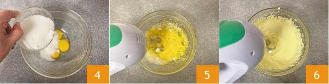 Puis faites de même avec les jaunes, versez le sucre 4 et fouettez 5 pendant au moins 5 minutes pour obtenir une mousse claire 6.