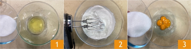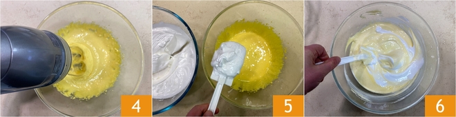 Montez au batteur électrique jusqu'à obtenir un mélange mousseux et clair 4. Incorporez les blancs en neige dans le mélange de jaunes d'œufs petit à petit avec une spatule 5, en remuant délicatement de bas en haut pour ne pas les faire retomber 6.
