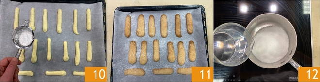 Saupoudrez les biscuits à la cuillère de sucre semoule et de sucre glace 10, puis faites cuire dans un four statique préchauffé à 180°C pendant environ 15 minutes. Sortez-les du four et laissez-les refroidir 11. Pendant ce temps, préparez la crème : dans une casserole, versez le sucre et l'eau 12.