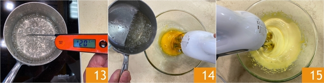 Portez le mélange à 121°C en mesurant la température avec un thermomètre de cuisine 13 ; si vous n'avez pas de thermomètre, le sirop est prêt lorsque de petites bulles blanches se forment à la surface. Un peu avant d'atteindre les 121°C (donc vers 115°C), commencez à monter les jaunes d'œufs avec un batteur électrique. Une fois les 121°C atteints, versez-le en filet sur les jaunes d'œufs en maintenant le batteur à basse vitesse 14. Continuez à battre jusqu'à complet refroidissement 15.